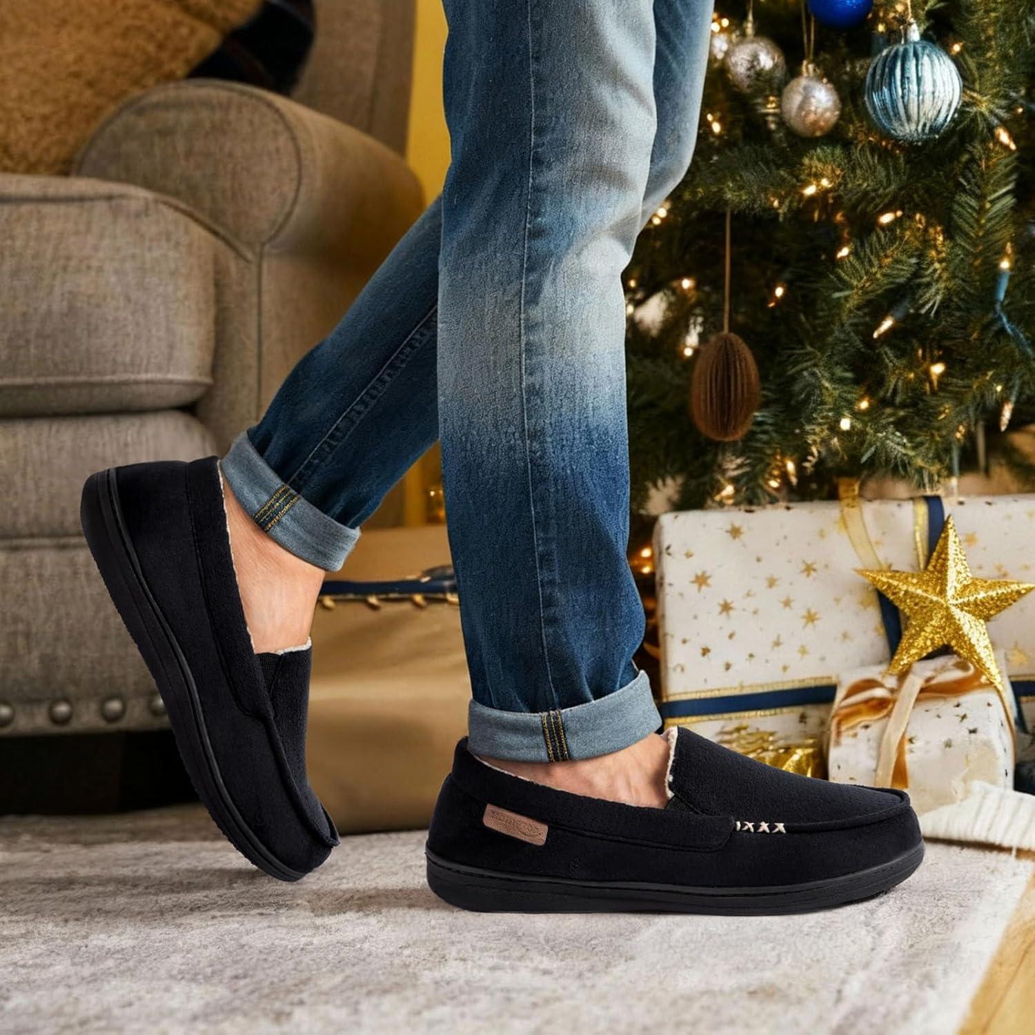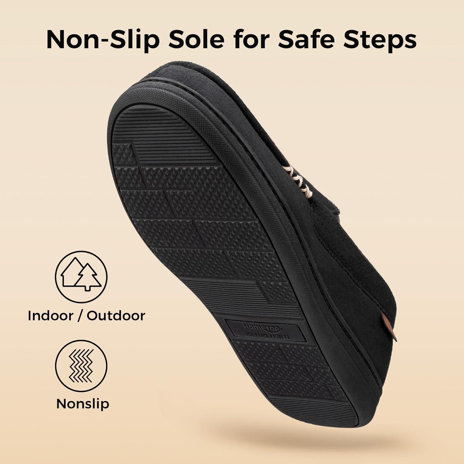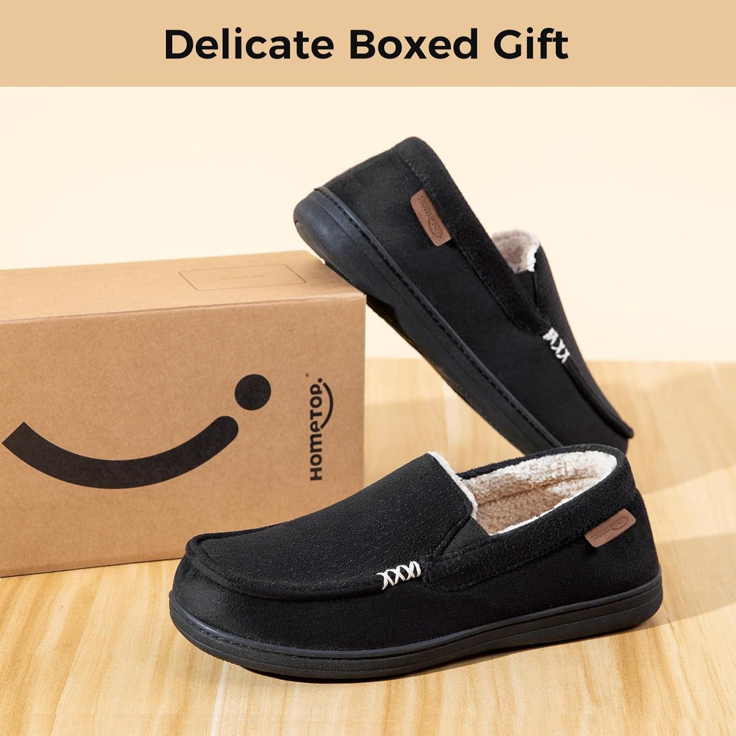 HomeTop Men’s Classic Moccasin Slippers Comfy Memory Foam Indoor House Shoes(Space Black)