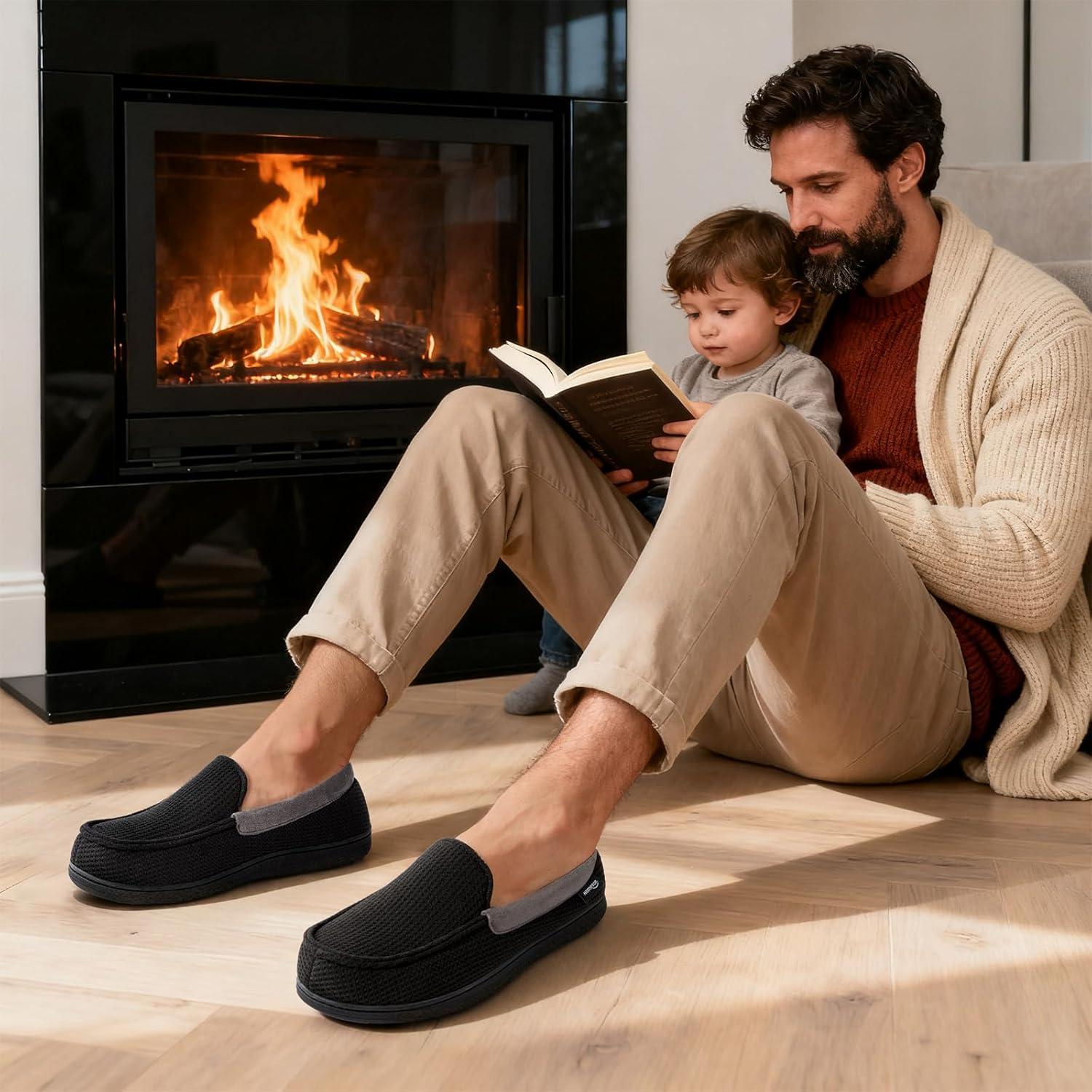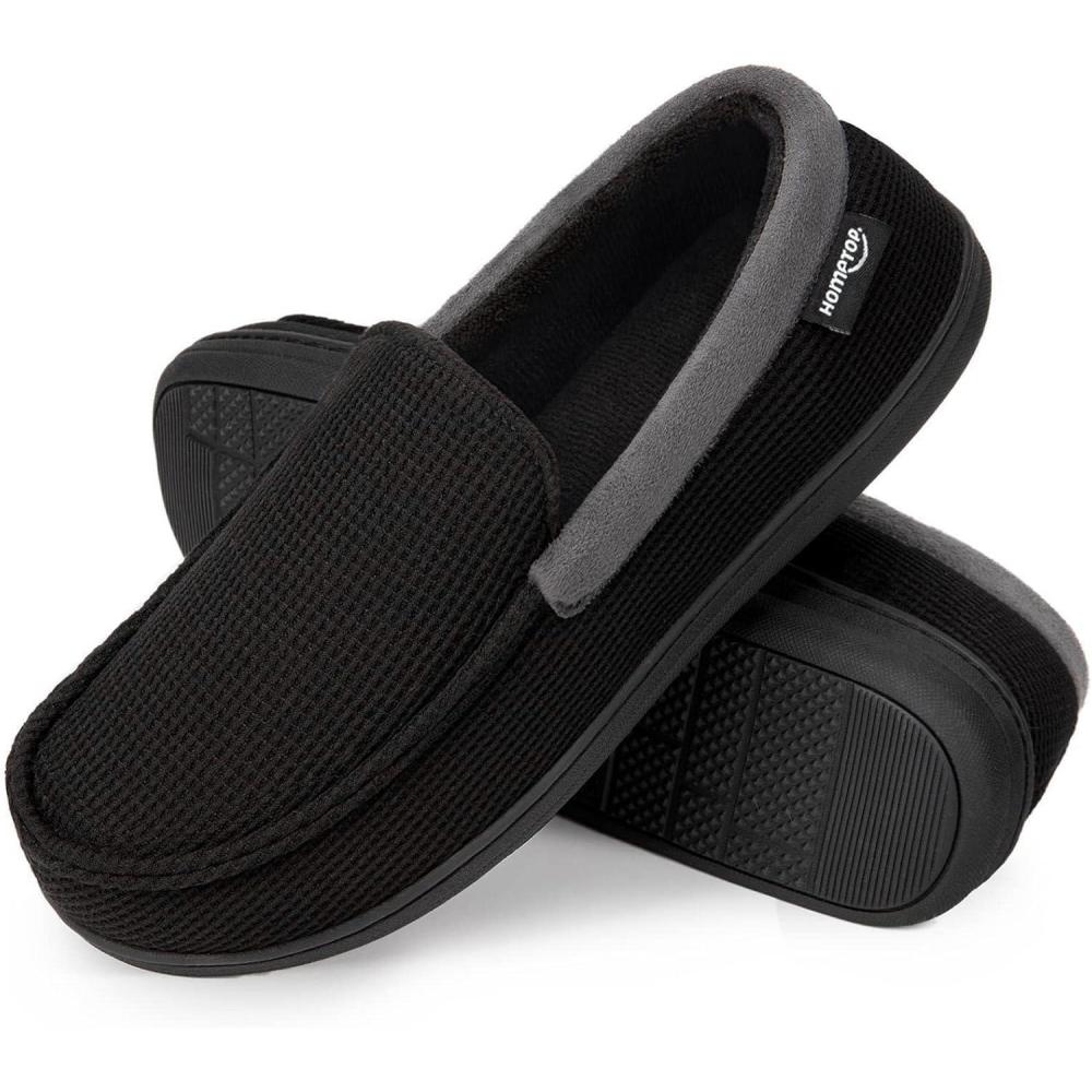 HomeTop Men’s Comfort Memory Foam Moccasin Slippers, Breathable Cotton Knit Terry Cloth House Shoes for Indoor Outdoor(Black)